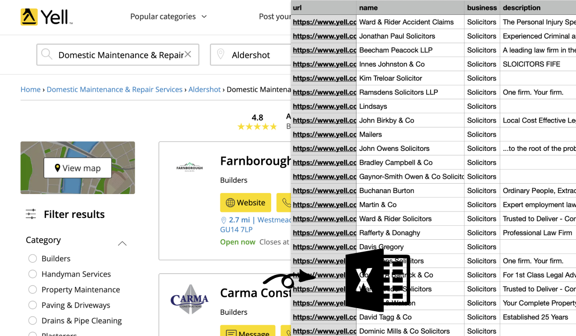 Yell Scraper helps you extract business contact information including website, phone, address, and ratings from Yell.com. Save UK local business lead lists to CSV / Excel / JSON with one click.